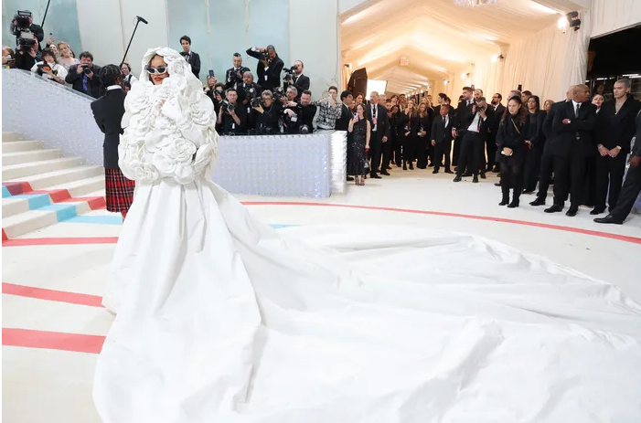 ارتدت ريهانا فستان من تصميم فالنتينو، وارتدت فستان أبيض من الحرير مزين بذيل طوله 5 أمتار ورأس يضم 30 زهرة كاميليا مكونة من 500 بتلة