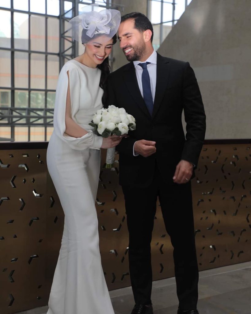 سبق هذه المناسبة احتفال العروس بعقد قرانها في أبوظبي واختارت للمناسبة إطلالة بيضاء حملت توقيع دار إيلي صعب أيضاً. تألفت هذه الإطلالة من جامبسوت تميز بطابعه العصري البسيط وترافق مع أكسسوار للرأس من CB Headpieces مستوحى من طراز قبعات العائلة المالكة البريطانية كما حملت بيدها باقة من الفوانيا البيضاء.