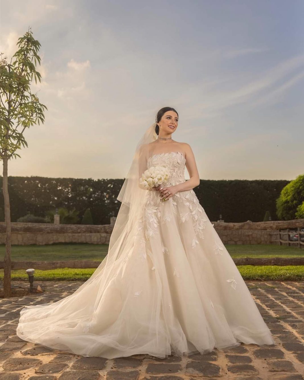 تألقت النجمة اللبنانية ماريتا الحلاني في حفلة زفافها بإطلالة رومانسية رقيقة تألفت من فستان عاري الكتفين باللون الأبيض السكري، تم تنفيذه بخامة التول وتزيينه بتطريزات على شكل أوراق الغار، اختارته من مجموعة إيلي صعب لأزياء الزفاف الخاصة بخريف 2023. وقد رافق الثوب طرحة طويلة تم تثبيتها تحت أكسسوار معدني غطى جزءاً من التسريحة.