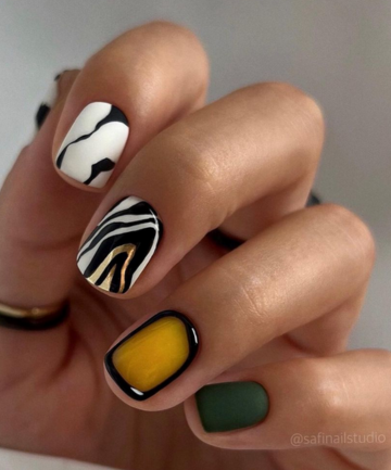 فكرة تصميم الأظافر هذه تستخدم ألوان مطفية وداكنة، لكن بسبب تصميمها الرائع والمتوازن بصرياً، يمكنك تخصيصها وتغيير الألوان في أي وقت يلزم ذلك وفقاً لمزاجك.