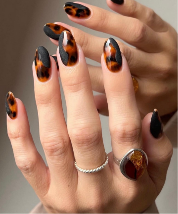يعتمد هذا التصميم على تعدد الألوان الأنيق للأظافر ويحتوي على طبعات حيوانية، تفاصيل معدنية، وتأثير مطفي، ويبدو رائعاً على الأظافر القصيرة. - تصميم تورتلشيل: