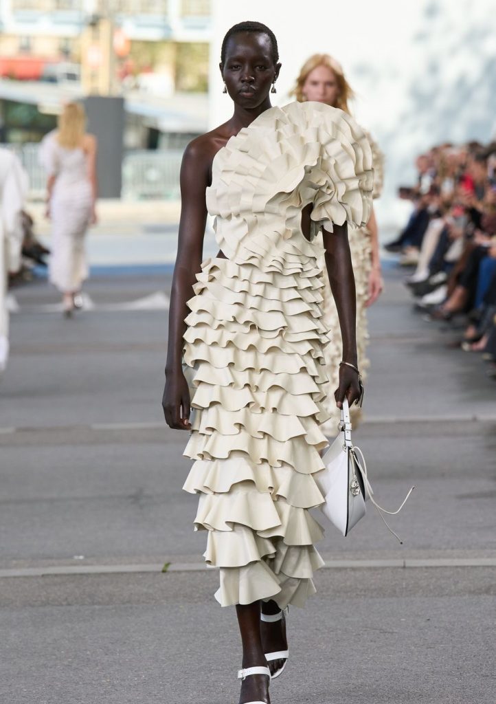 قدمت مصممة دار كلوي “غابرييلا هيرست” أداءً رائعًا. تنبعث من مجموعتها كل الأناقة والثقة والأنوثة التي تميز الدار الفرنسية الأيقونية، ولكنها بقيت أيضًا مخلصة للجمالية والقيم التي تميزها كمصممة. تم التلميح برقة إلى تشجيعها على الاستدامة من خلال موضوع نباتي، حيث ترجمت هذه الفكرة إلى تجمعات من الكشكشات تنساب كالكرمات وألواح الشيفون المتدلية من صدور العارضات كأزهار متفتحة. ومع لوحة ألوان تقريبًا سوداء وبيضاء بالكامل، اللون الأصفر والمرجاني والفضي اللامع يظهر على فترات، ركزت على التصميمات الابتكارية ولكنها قابلة للارتداء التي أصبحت هيرست متقنة لها.