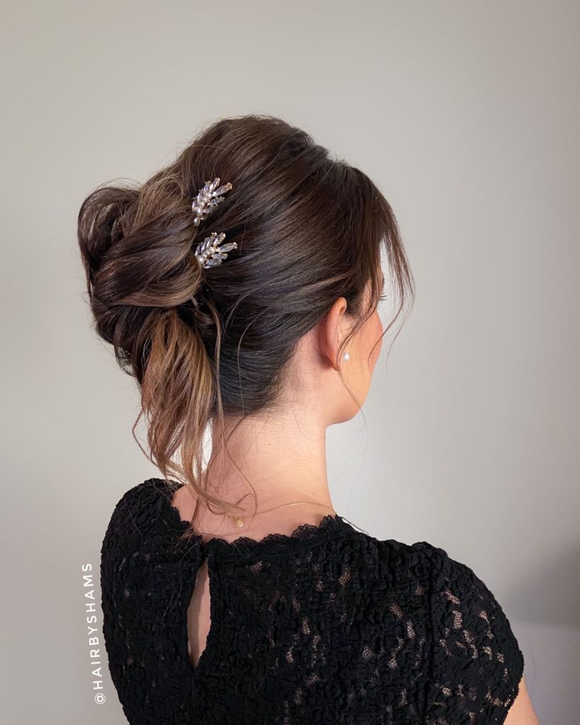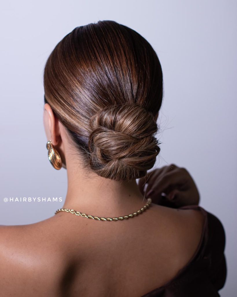 اجمعي شعركِ في كعكة منخفضة عند قاعدة رقبتكِ، ثم التفي بالكعكة نحو الداخل وثبتيها باستخدام دبابيس الشعر للحصول على تأثير الشعر المخبأ. ينصح بترك بعض خصل الشعر تحيط بوجهك لزيادة مظهر طبيعي.
