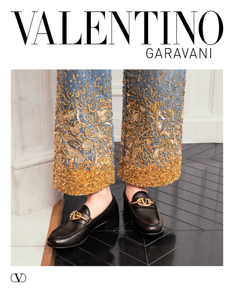 تظهر العلامة التجارية الرمزية V لفالنتينو، سواء كانت مخفية بلون متناسق أو متألقة بفضل الكريستالات الصغيرة، بالإضافة إلى تفاصيل الورد على القمصان ليتناغم بشكل جميل. على الرغم من أن الموسم يتميز بظلال أنعم، إلا أن فالنتينو يضيف لمسة من الأناقة إلى الإطلالات. يقدم تصاميم الريشي والفساتين المصنوعة من الكريستال بألوان هادئة، مع خيارات دينيم فاخرة، جينز يمكن اللجوء إليه في اللحظة الأخيرة.