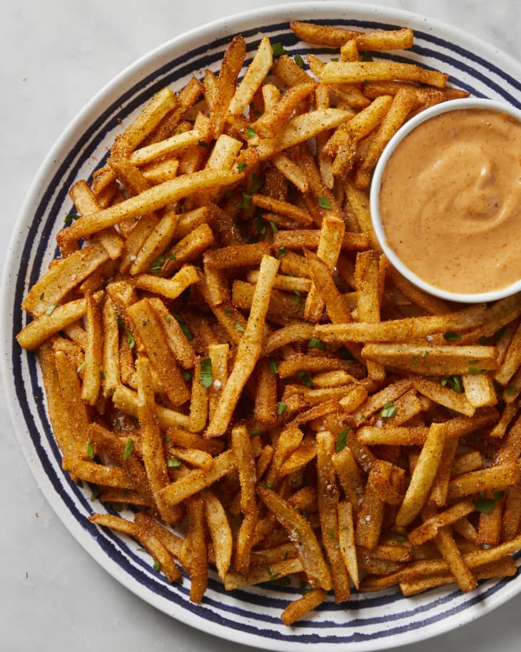 – اقلي البطاطس في دفعات حسب سعة وعاء القلي، حتى تصبح ذهبية ومقرمشة. ثم قومي بتقليب البطاطس من 2-4 دقائق باستخدام ملعقة مثقبة لضمان تحميرها بالتساوي.