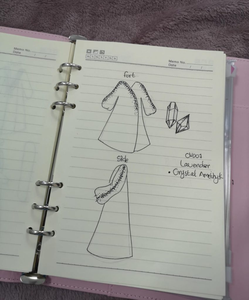 من بين تصاميم مزنة الأكثر تميزًا عباءة الكريستال، حيث اختارت قماشًا خفيفًا يلمع مع الحركة والضوء، مما يمنحها مظهرًا كريستاليًا. ولإضفاء لمسة فريدة، أضافت فصوصًا خفيفة لتعكس أناقة وسحر الكريستال.