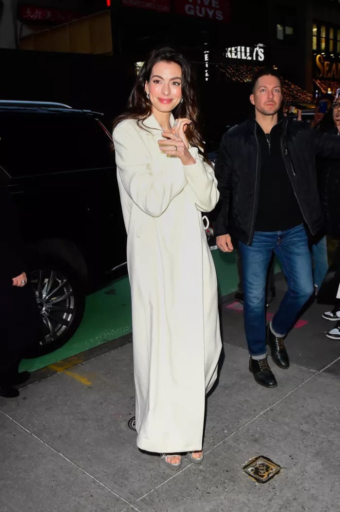 حلّت النجمة آن هاثواي مؤخراً ضيفة في برنامج The Tonight Show لـجيمي فالون، بإطلالة شتوية بيضاء، وارتدت تنورة بيضاء متوسطة الطول وعالية الخصر مع شق جانبي مرتفع محدد بالترتر الفضي، وأضافت للقسم العلوي مشداً قصيراً بدون أكتاف، يتميز بالخرز اللامع بنمط شبكات. وأكملت إطلالتها مع حذاء بكعب عالٍ فضي اللون، ومجموعة ألماس تتضمن من الخواتم والأساور وزوج من الأقراط المتدلية. وارتدت معطفاً أبيض طويلاً غطى الأرض. كما تميزت تسريحة شعرها باللون البني الشوكولاتة مع تصفيفة لطيفة بتموجات مشعثة وفرق جانبي، وأكملت مظهرها بلمسات مكياج من أحمر الخدود الوردي وملمع الشفاه الوردي.