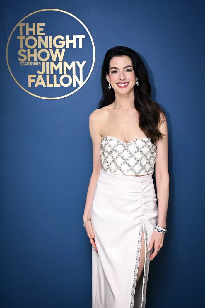 حلّت النجمة آن هاثواي مؤخراً ضيفة في برنامج The Tonight Show لـجيمي فالون، بإطلالة شتوية بيضاء، وارتدت تنورة بيضاء متوسطة الطول وعالية الخصر مع شق جانبي مرتفع محدد بالترتر الفضي، وأضافت للقسم العلوي مشداً قصيراً بدون أكتاف، يتميز بالخرز اللامع بنمط شبكات. وأكملت إطلالتها مع حذاء بكعب عالٍ فضي اللون، ومجموعة ألماس تتضمن من الخواتم والأساور وزوج من الأقراط المتدلية. وارتدت معطفاً أبيض طويلاً غطى الأرض. كما تميزت تسريحة شعرها باللون البني الشوكولاتة مع تصفيفة لطيفة بتموجات مشعثة وفرق جانبي، وأكملت مظهرها بلمسات مكياج من أحمر الخدود الوردي وملمع الشفاه الوردي.