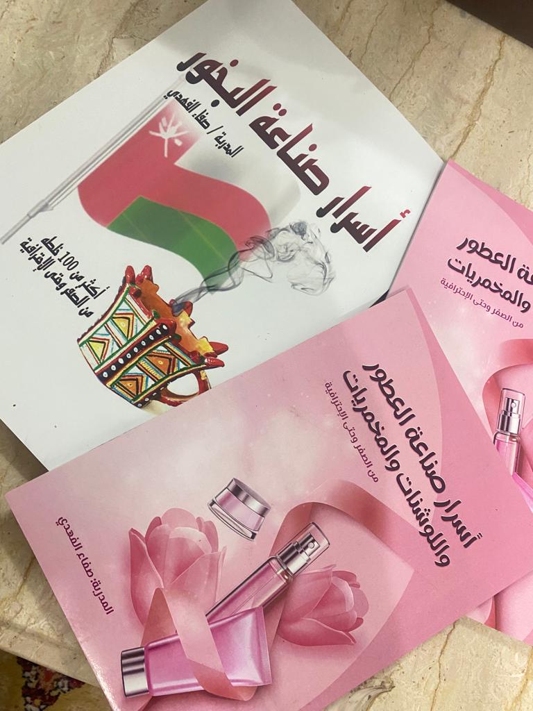 لم تكتفي صفاء بتقديم خبراتها من خلال الدورات التدريبية بل قامت بتأليف كتب حول ذلك. تقول: لقد قمت بإعداد كتاب شامل كموسوعة في فن صناعة البخور، يحتوي على أكثر من 100 خلطة متنوعة. بالإضافة إلى ذلك، قمت بإنشاء كتاب يكشف عن أسرار صناعة العطور واللوشنات والمخمريات، ولاقى إقبالًا كبيرًا من الزبائن ورواد الأعمال. لم يكن دوري مقتصرًا على الكتابة فقط، بل قمت أيضًا بتقديم تدريب لأصحاب المصانع والتجار، الذين نجحوا في تأسيس مشاريعهم وافتتاح محلاتهم بفضل الدعم والتوجيه الذي قدمته. كما شاركت بنشاط في مجموعة من المعارض والفعاليات لعرض منتجاتي الفريدة والمميزة.