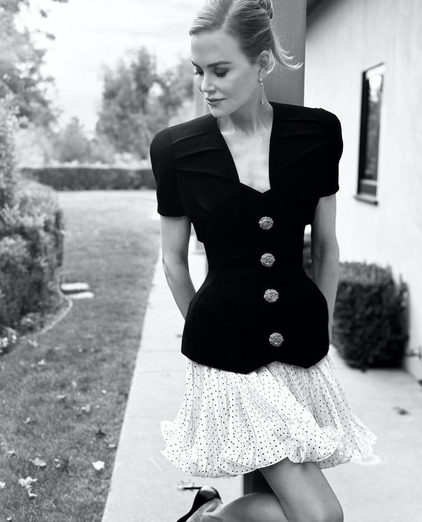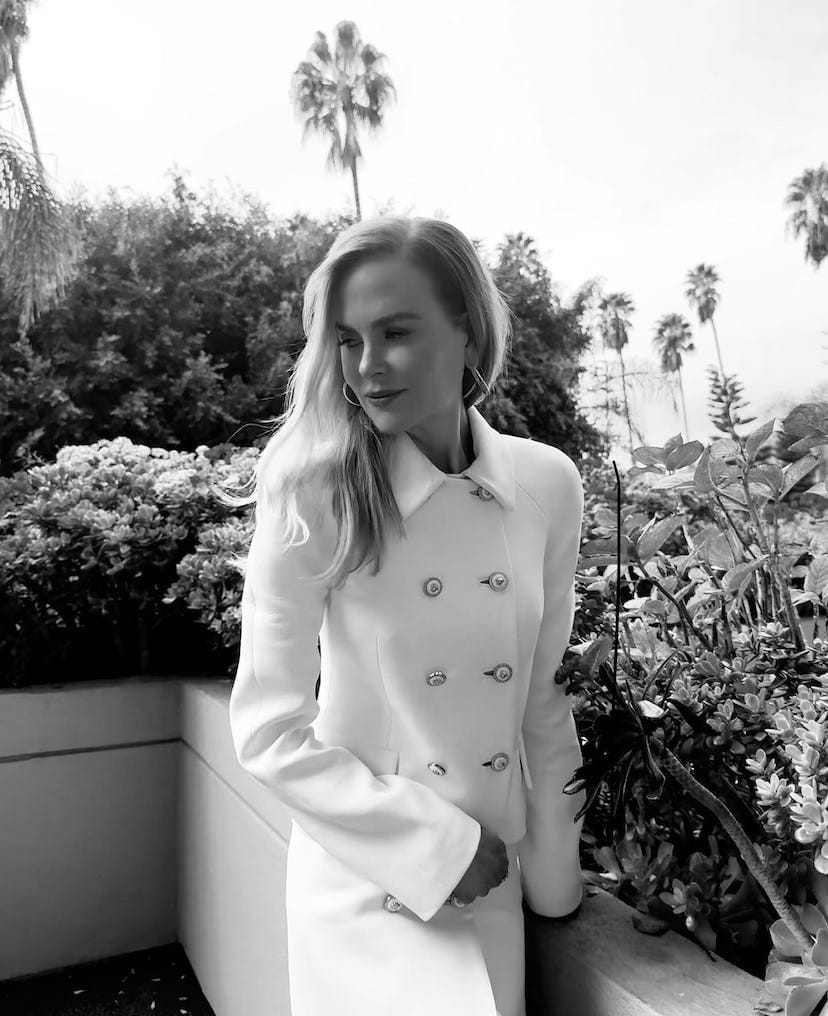 ونشرت كيدمان صورة أخرى تميّزت بإطلالة أنيقة غطّاها معطف بيكوت من فيرساتشي ذو صفين من الأزرار الكبيرة بالمنتصف، وقبلة مثنية. بدت جذابة بالأناقة الكلاسيكية.