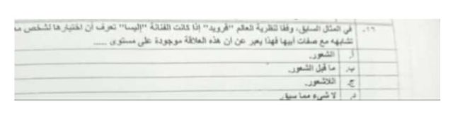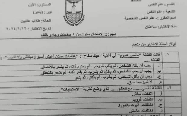 وتضمن الامتحان عدة أسئلة اختيار من متعدد، وجاء نص السؤال في الامتحان: “قالت الفنانة نانسي عجرم في أغنية “حبك سفاح”. علشانك ممكن أعيش أسبوع مبكلش ولا أشرب”، وتساءلت أستاذ المادة عن مدة تطابق ذلك، أو اختلافه مع أحد علماء علم النفس الذي وضع نظرية “الاحتياجات”، فيما تضمن الامتحان سؤالاً آخر لنفس المادة مفادة “قالت الفنانة إليسا في أغنية حالة حب: وانا جنبك شايفه منك حاجة من ريحة أبويا.. يعبر الأب وفقا لنظرية العالم.. عن نموذج السند والدعم”.