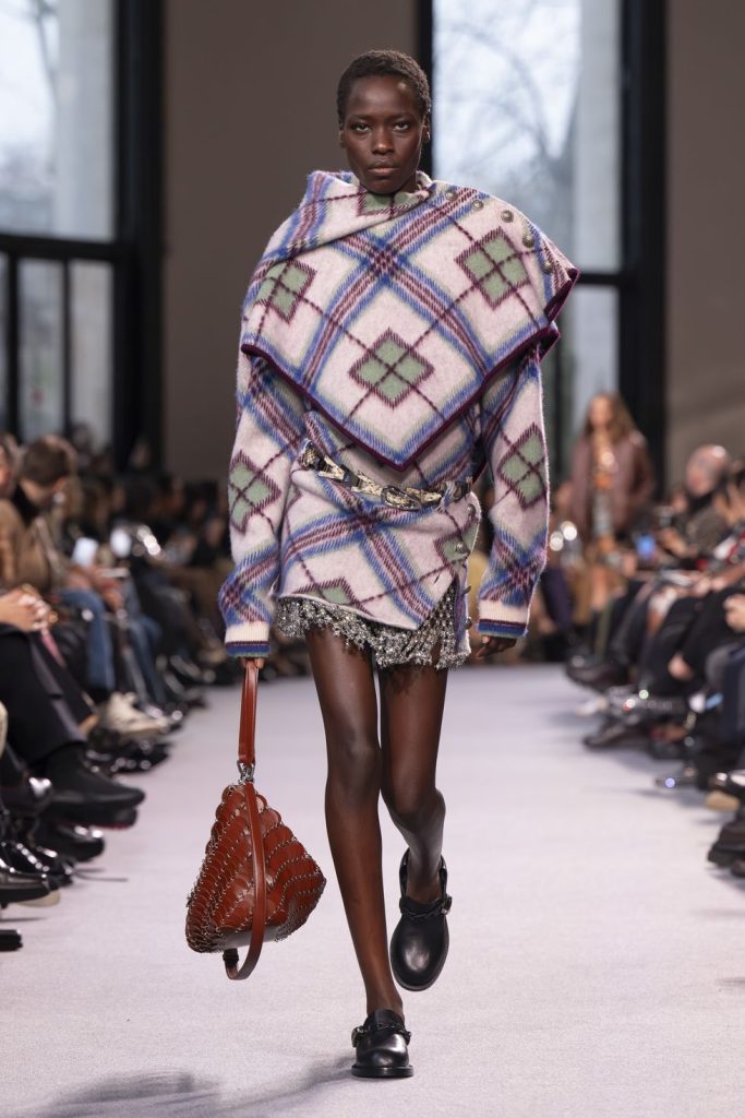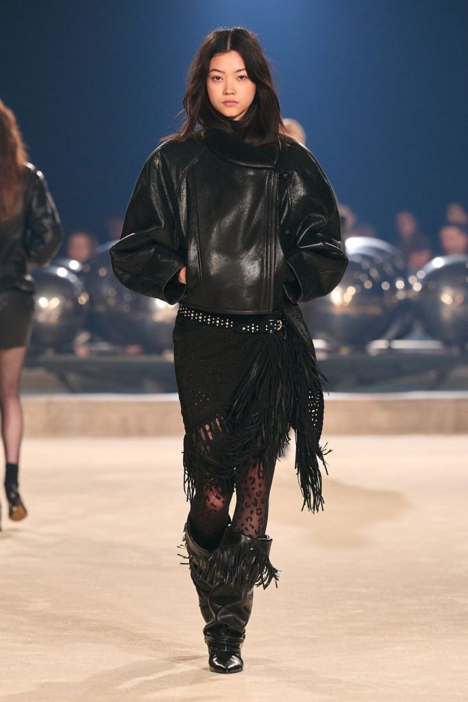مشبعة بالرغبة في السفر وطاقة عاتية، اتجهت إيزابيل مارانت إلى الغرب لموسم الخريف/الشتاء 2024. وقدّمت قطع أنيقة للغاية تتميز ببصمة مارانت، فكل قطعة تُعرف على الفور بأنها تنتمي إلى العلامة التجارية. من الأحذية الطويلة إلى السترات العصرية من الجلد المدبوغ مع حواف رائعة والأجزاء المعدنية الثقيلة. وغلب على القطع اللون الزيتوني متداخلاً مع اللون الأحمر ومجموعة متنوعة من طبعات الحيوان، التي تتلاعب بالملمس واللمعان. والتألق. استمدت التصاميم الأسلوب والروح من الثمانينات، مما قدم لنا رؤية لملابس الخروج بلمسات أنيقة وعصرية.