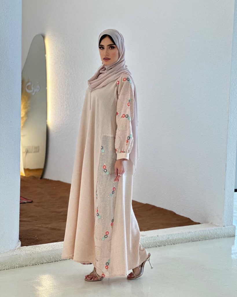 ويتميز أسلوب “رحمة” بتوظيف مجموعة متنوعة من الخامات الطبيعية والأقمشة ذات الجودة العالية ودمجها بشكل متقن، مما يعكس اهتمامها بالتنوع والجودة في تصاميمها.