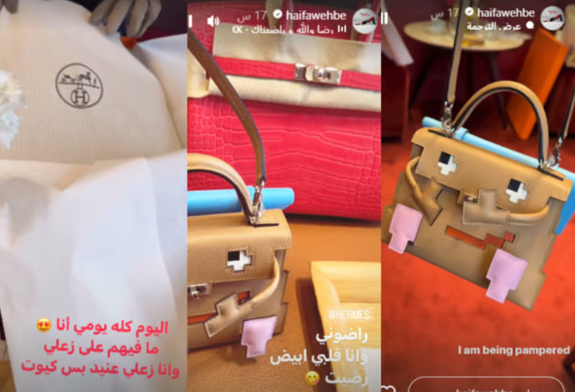 و شاركت هيفاء مقاطع فيديو للهدايا التي تلقتها، ونشرت صورة لحقيبة صغيرة وردية تلقتها كهدية من “Hermès”، معلقة: “يجري تدليلي”.