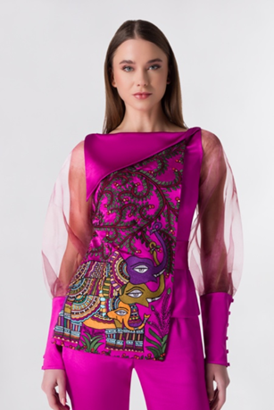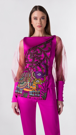 غالبًا ما يظهر الفيل في القصص التقليدية القديمة كسيد على الغابات والمناظر الطبيعية، يعيش حياة متواضعة في أعماق نعمة الطبيعة الساحرة. تُستخدم هذه الفكرة بشكل متكرر من قبل المصممة مانيشا في لوحاتها المادهوباني، حيث يُعتبر الفيل رمزًا للقوة الهادئة والازدهار. حيث نجد طقم الثلاثية الرائعة “Magnificent Three”، الذي يتكون من بلوزة ناعمة وبنطلون من ضمن اللوحات الفاخره لماروشيكا، ، حيث يتجسّد ثلاثة فيلة يخطون عبر الغابة، مطلين بألوان عميقة تتناقض بشكل مبهج مع سطوع الساتان الحريري الوردي الفوشيا الفاخر، الذي يبرز جمال المرتدين. يُعد هذا الطقم إضافة ملفتة وجريئة لأي خزانة ملابس، فهو يُثير الأمل في قلوب الجميع. كما يتميز الجزء العلوي بزخارف كريستالية مفصلة وتطريزات مذهلة على الظهر، تصوّر الزهور الحمراء الرقيقة وهي تتفتح على الأغصان الدوامية.
