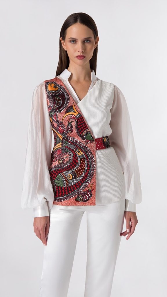 بينما في طقم “Cheerful Matsya”، نجد تصميمًا مائيًا جريئًا ومذهلاً يتميز بالحيوية، مع تفاصيل مذهلة من الكريستال اللامع وطبعات نابضة بالحياة. حيث يأتي البنطلون بلون أبيض من الساتان الحريري يصل إلى الكاحل، مما يضيف لمسة من الأناقة الرقيقة. تُعتبر الأسماك رمزًا للخصوبة والازدهار في ثقافة مادهوباني، ووجودها يعبر عن التوازن والانسجام بين جميع عناصر الطبيعة. يمثل الطقم مزيجًا فاخرًا من الأورجانزا والشيفون بطيات، مما يوفر صورة ظلية ديناميكية وانسيابية تتيح لمرتديها التميز والتألق.