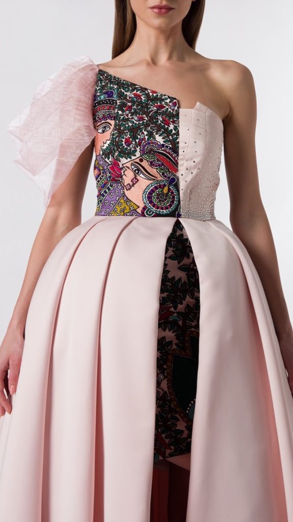 هذا الفستان المذهل، الذي يشبه القصص الخيالية، يمزج بين الفخامة والأناقة بشكل مدهش. يتداخل اللون الوردي الفاتح الساحر مع زخارف مادهوباني المميزة، حيث يُزيّن رجل وامرأة الفستان بلباسهما التقليدي،  يرمزون إلى الانسجام والتفاهم، مع تعزيز الرسالة من خلال وجود الطيور الملونة على أغصان الشجرة، ممثلة للحرية والأمل والسلام. يمتد التصميم إلى التنورة السفلية الواسعة، المزيّنة بعناية وتفاصيل ملفتة للنظر. هذا الفستان يجسّد الجمال والرقي، مع نسيج غني يجمع بين جمالية اللوتس والطبيعة المعقدة. يبرز اهتمام ماروشيكا الاستثنائي بالتفاصيل، مما يمنح من يرتدي الفستان لحظة أنيقة، حيث يستطيعون احتضان أنوثتهم وجمالهم في كل زمان ومكان.
