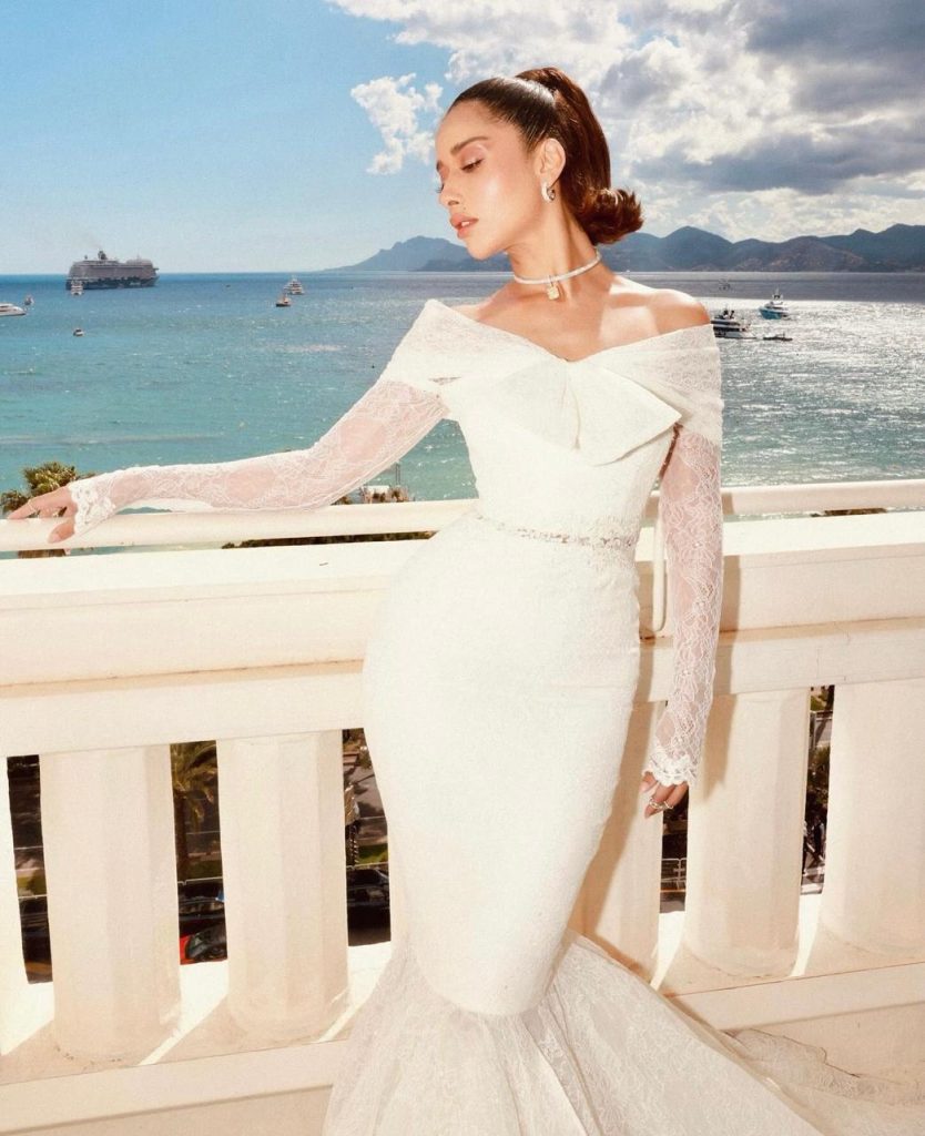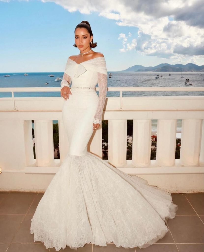 جذبت بلقيس فتحي الأنظار خلال مهرجان كان السينمائي بإطلالة رائعة بفستان أبيض من تصميم “جيامباتيستا فالي”، من قماش الدانتيل بقصّة الحوريّة مكشوف عند الكتفين، وبأكمام طويلة مكشوفة، وعقدة الفراشة التي زيّنت منطقة الصدر.