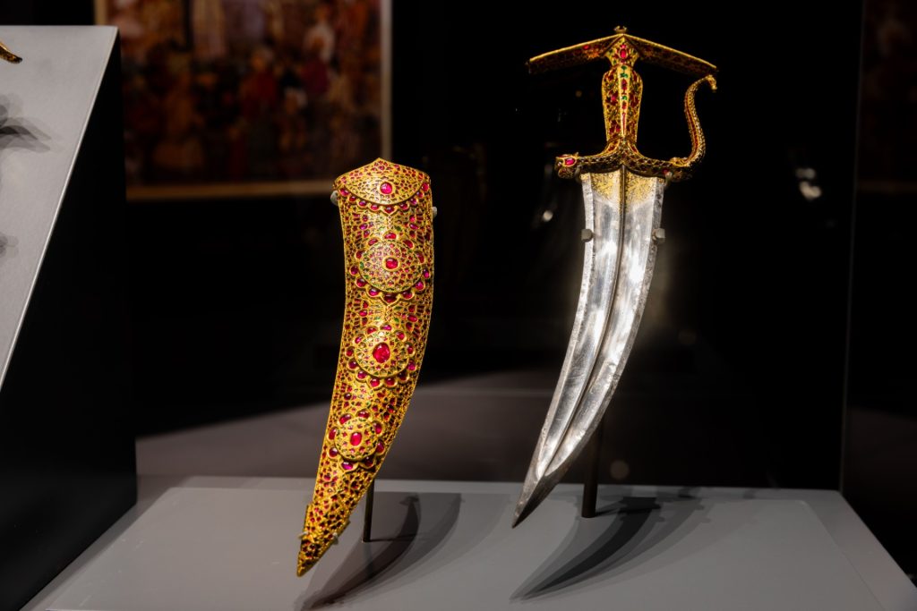 وتتضمن المجموعة المشاركة في المعرض، حَجَرًا كريمًا يَحْمِلُ أقدم وأكبر نقش باسم الحاكم التيموري “أولوغ بيك”، حفيد أمير تيمور “تيمورلنك”، وتَمَّ نقشه قَبْلَ وفاته في عام (1449م)، وقلادة من حَجَرِ اليَشم باسم الإمبراطور المغولي “شاه جهان” تَعودُ إلى الفترة (1637 و1638م)، وخاتم رماية باسم الإمبراطور خلال الفترة (1651 -1652م). كما تتضمن مجموعة مُتَعدِّدة من الخناجر والسَّكاكين والسيوف مُرصَّعةً بالجواهر الثمينة كالألماس والأحجار الكريمة تَعْكِسُ بَهاء الحضارة الإسلاميَّة الهندية وتَقَدُّم صناعة السيوف والخناجر في تلك الفترة.