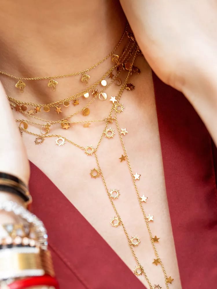 أظهرت منصات عرض الأزياء أنّ أحد أساسيات مجوهرات الصيف ستكون قلائد الطبقات، وكلما كانت أطول، كان ذلك أفضل. يستوحي اتجاه القلائد المكدسة تصاميمه من الشلالات، فتبدو السلاسل متدلية بطبقات متعددة من ملابسك الصيفية.