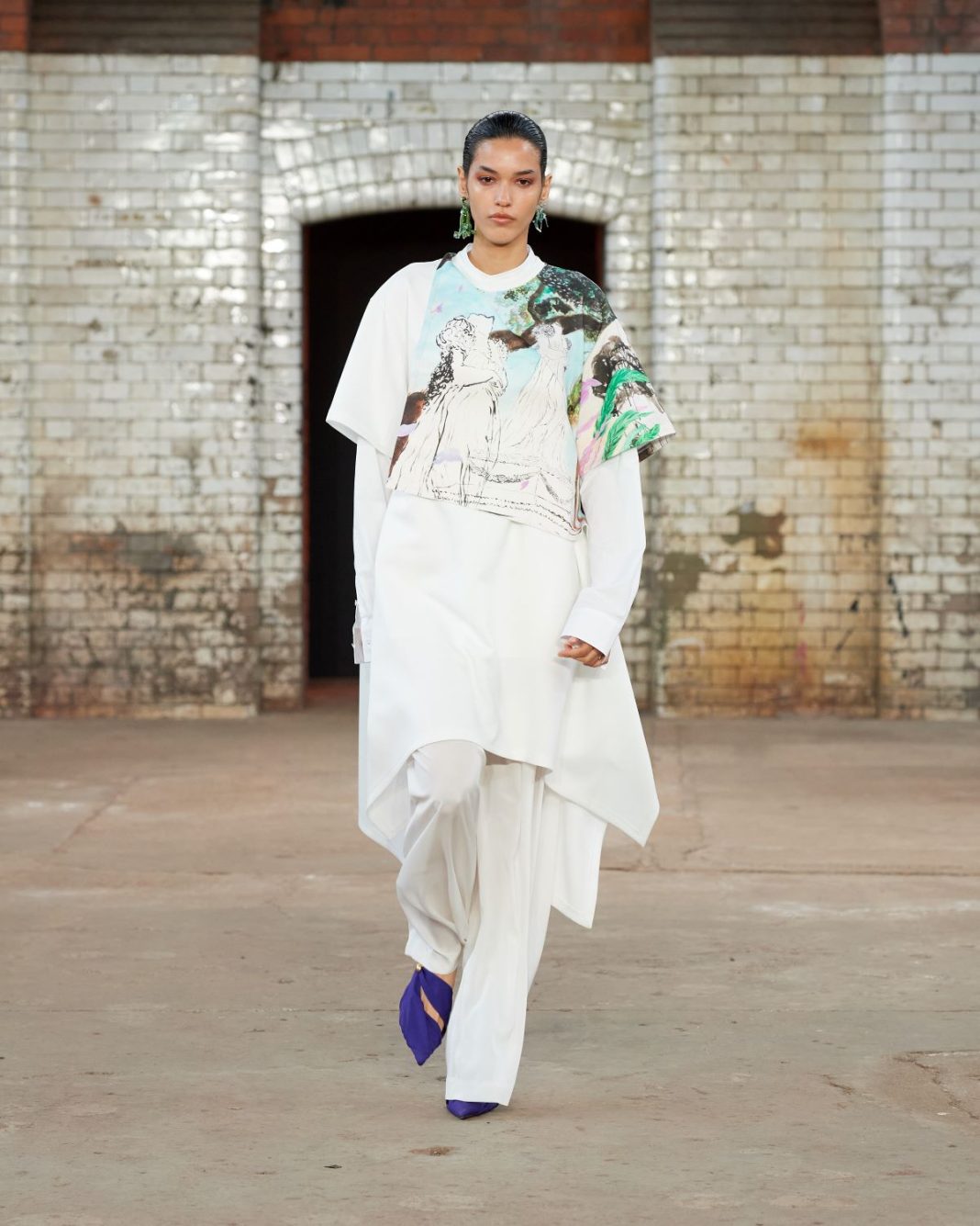 بدأت المجموعة بالصور الظلية الانسيابية باللون الأبيض، تلاها أزياء متعددة الطبقات وبدلات مصنوعة من الساتان اللامع. تميزت تصاميم القمصان والمعاطف بتقنيات اللف المميزة، فيما تألقت درجات الأزرق النابضة بالحياة على الدبابيس الملتفة. واستخدمت الأقمشة الفاخرة مثل التويل الحريري والفوال القطني، بالإضافة إلى الطباعة الرقمية لتجسيد مرور الوقت وتحوّل الأعمال الفنية.