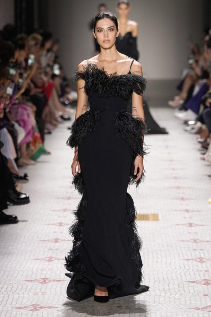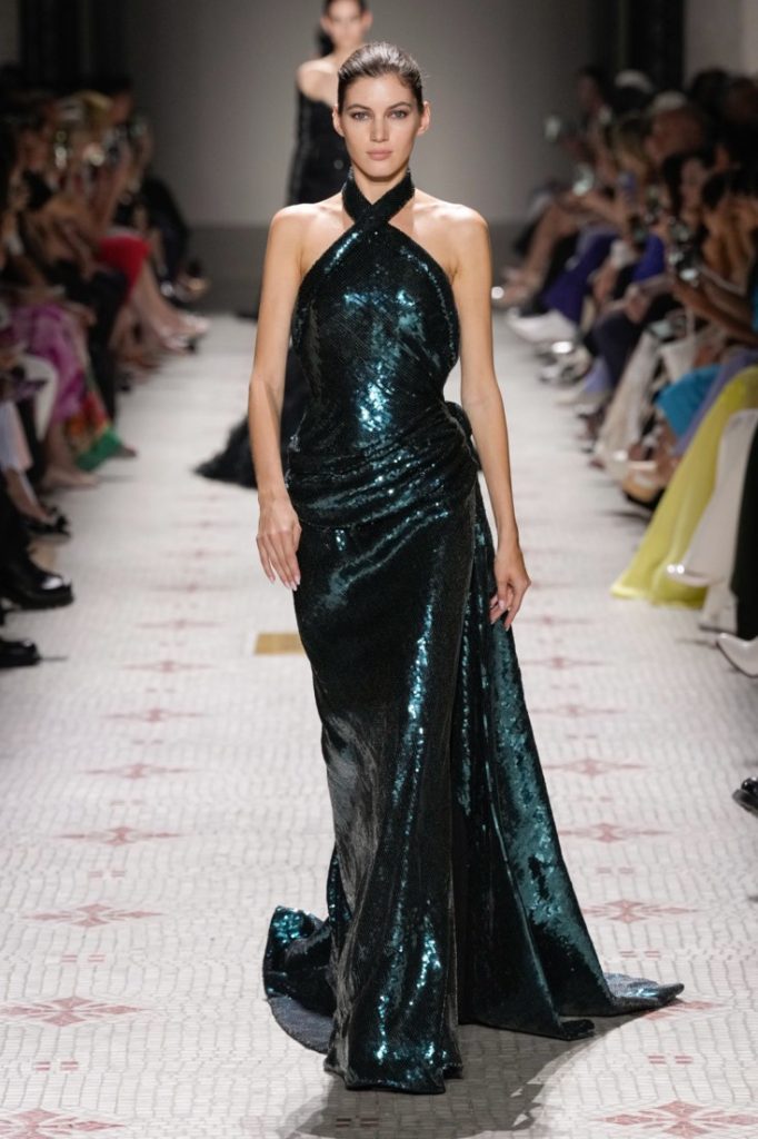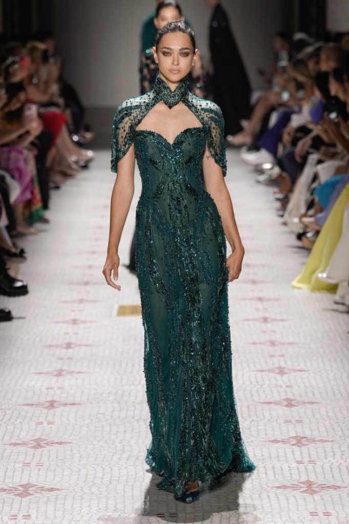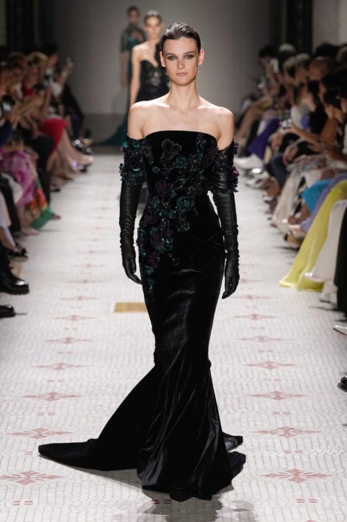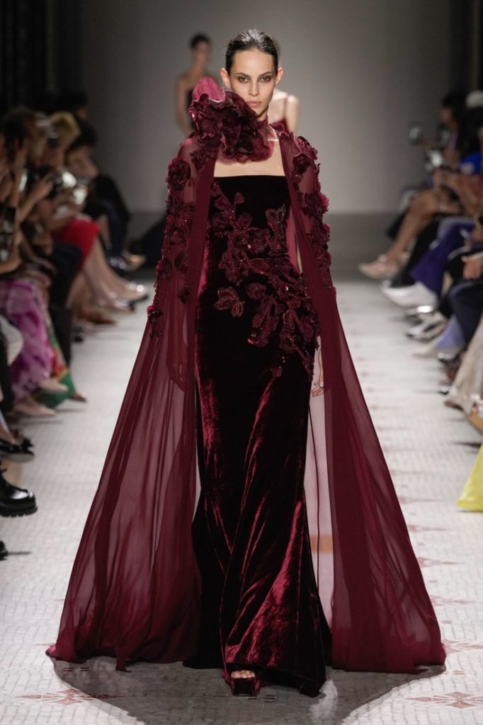 تنسج إيلي صعب قصة الأناقة والأنوثة من خلال تصاميم مترفة من المخمل الفاخر المزين بالتطريزات الراقية والخيوط الذهبية المتشابكة. تمتزج الأورجانزا الفاخرة برقة كحوريات في طيات ساتان أسود ياقوتي رقيق، مما يخلق لعبة مدهشة بين الظل والضوء.