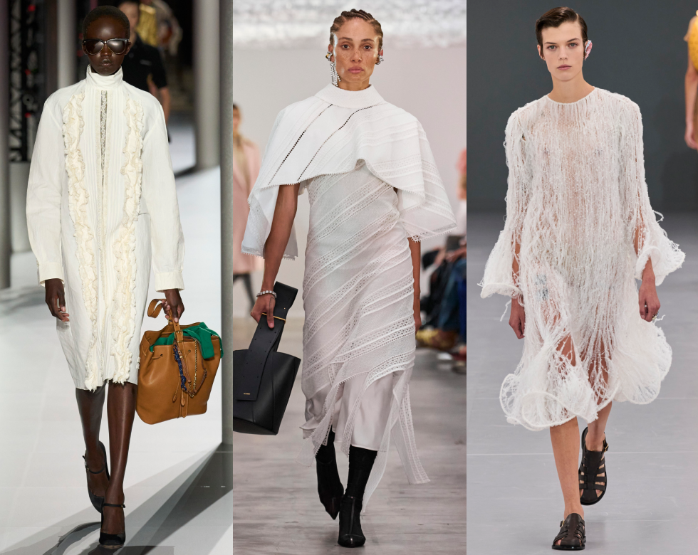 تصدرت القمم المزخرفة، والفساتين المثقبة، والطبقات من الدانتيل، والتنانير الدائرية البوبلين العروض على جميع المنصات. من فستان جوناثان أندرسون الأبيض المذهل في عرضه لويفي، إلى الطلة الملائكية الأنيقة والمتعددة الطبقات لجيل ساندر. تكتمل ألوان الأبيض الصيفية لهذا الموسم بطابع ممتع من صيحات الإكسسوارات لربيع 2024 والأحذية الرياضية الأنيقة والقلادات الحبلية جميعها صيحات موجودة هذا الصيف.
