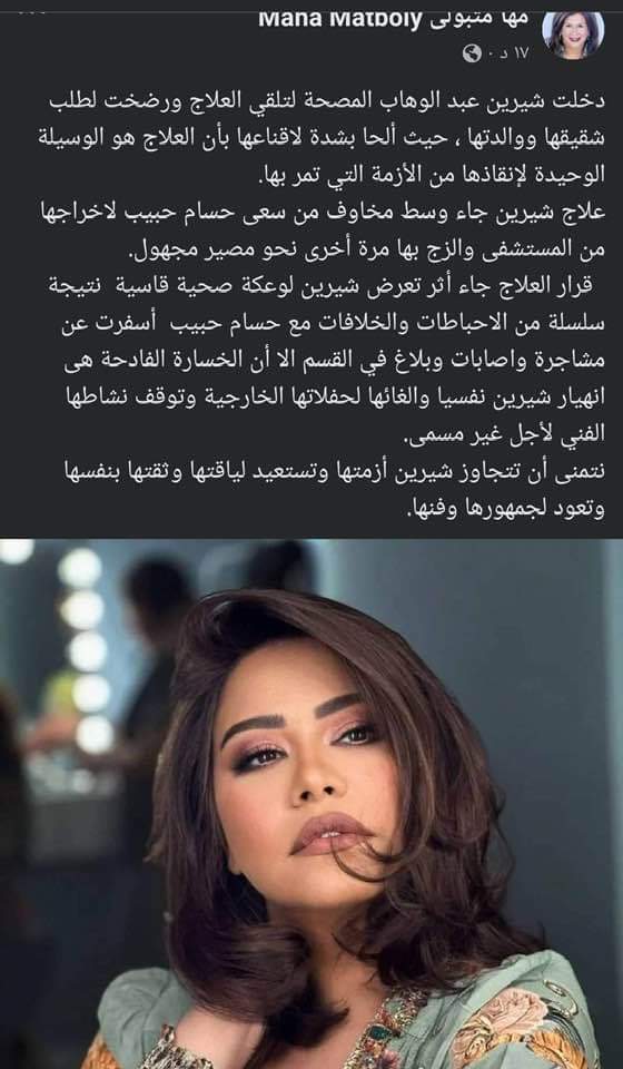 وكتبت الناقدة الفنية مها متبولي، عبر حسابها الرسمي بموقع “فيس بوك”، قائلة: “دخلت شيرين عبدالوهاب المصحة لتلقي العلاج ورضخت لطلب شقيقها ووالدتها، حيث ألحا بشدة لإقناعها بأن العلاج هو الوسيلة الوحيدة لإنقاذها من الأزمة التي تمر بها، علاج شيرين جاء وسط مخاوف من سعى حسام حبيب لإخراجها من المستشفى والزج بها مرة أخرى نحو مصير مجهول”.