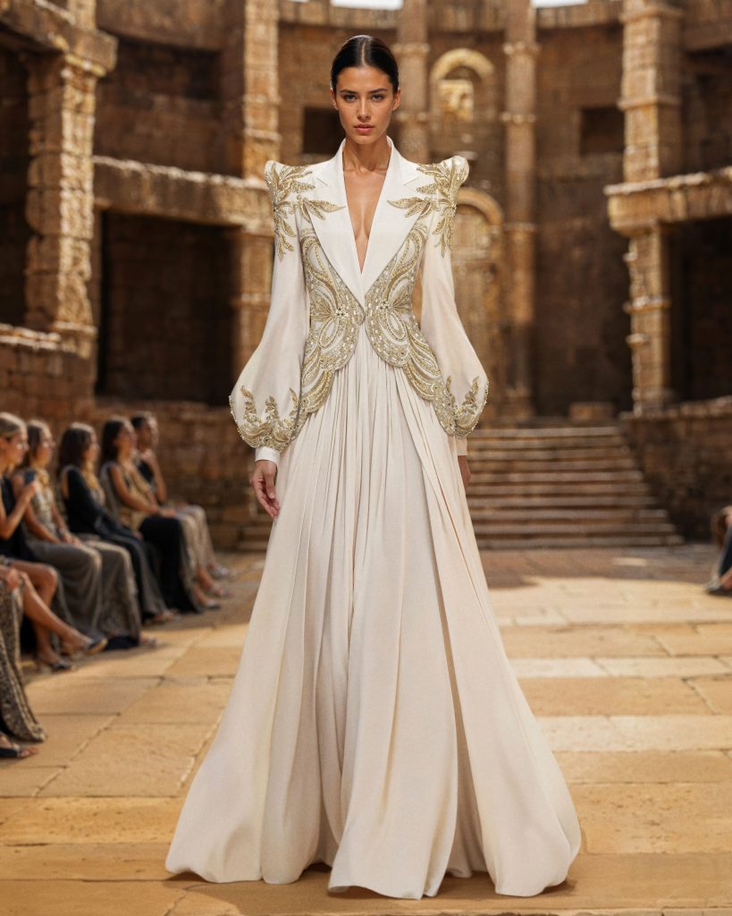 أبدع المصمم اللبناني سعيد قبيسي في مزج روعة الماضي مع جاذبية الحاضر في مجموعة من تصاميم الهوت كوتور لموسم خريف وشتاء 2024-2025. مستوحاة من إرث الحضارة المينوسية، التي تعود إلى 2500 عام قبل الميلاد، وتجمع بين الشرق والغرب بتفاصيلها الثقافية الفخمة والسلسة.