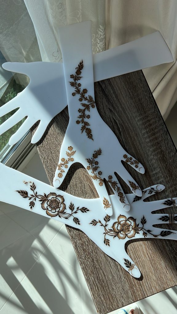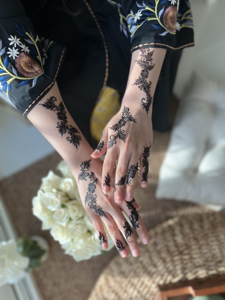 ولأن بعض الزبائن يجدون صعوبة في الوصول إلى موقعي لتجربة الحناء، فقد قمت بتوفير تصاميم خاصة لنقوشاتي على شكل ملصقات يمكن وضعها على اليدين.