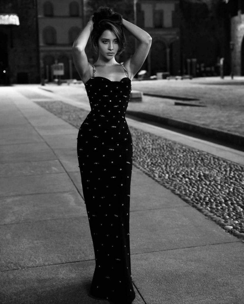 تميز الفستان الأسود، الذي ارتدته بتفاصيل رائعة من أحجار الكريستال اللامعة وقصته الطويلة التي تعانق الجسم، مع شق خلفي يسهل الحركة. كما جاءت حمّالات الفستان مرصّعة بسواروفسكي.