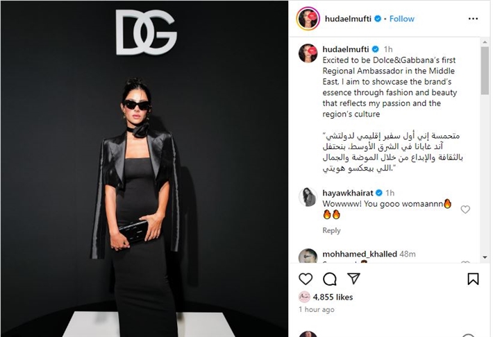 وأعلنت المفتي عن سعادتها بهذا الاختيار، حيث علقت قائلة: “متحمسة إني أول سفير إقليمي لدولتشي آند غابانا في الشرق الأوسط، بنحتفل بالثقافة والإبداع من خلال الموضة والجمال اللي بيعكسو هويتي”.