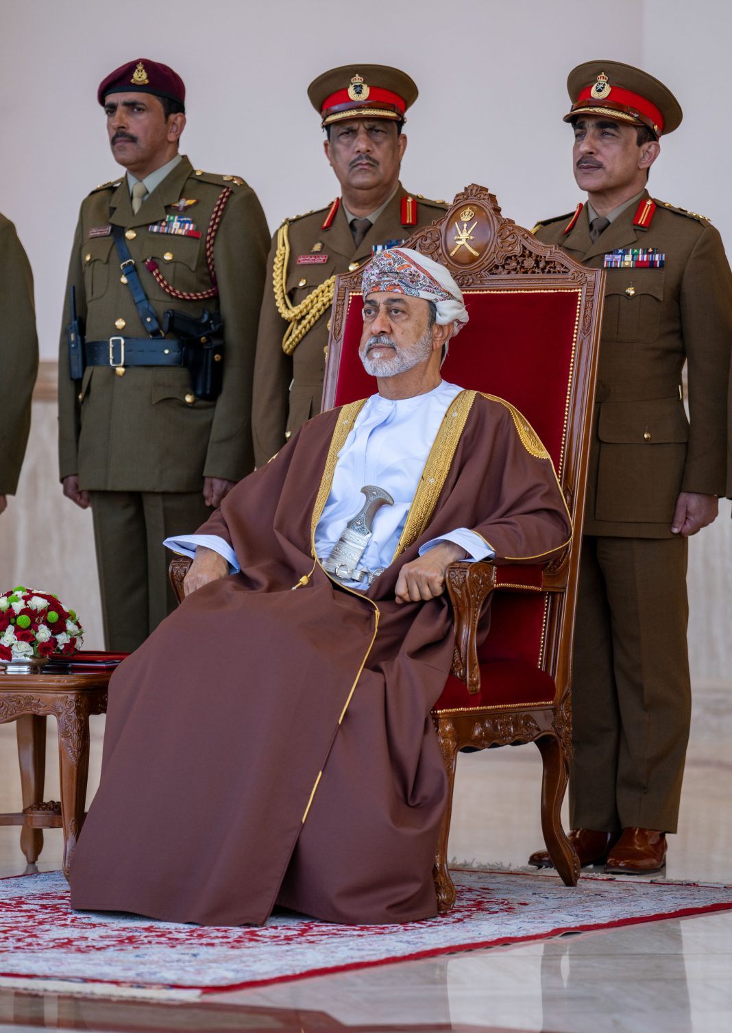 ولدى وصول حضرةِ صاحبِ الجلالةِ السُّلطان هيثم بن طارق المعظم القائدِ الأعلى/حفظهُ اللهُ ورعاهُ/ إلى ميدان الاستعراض تشرّف باستقبال جلالتِه صاحبُ السُّمو السّيد شهاب بن طارق آل سعيد نائبُ رئيس الوزراء لشؤون الدفاع، ومعالي الفريق أول سُلطان بن محمد النعماني وزيرُ المكتب السُّلطاني، والفريق الركن بحري عبد الله بن خميس الرئيسي رئيسُ أركان قوات السُّلطان المسلحة، واللواء الركن مسلم بن محمد جعبوب قائدُ قوّة السُّلطان الخاصّة.