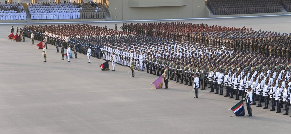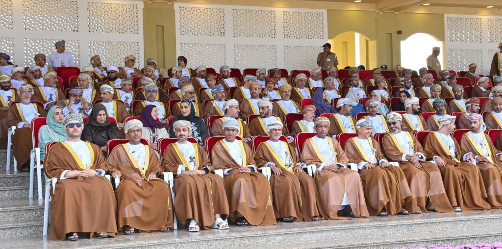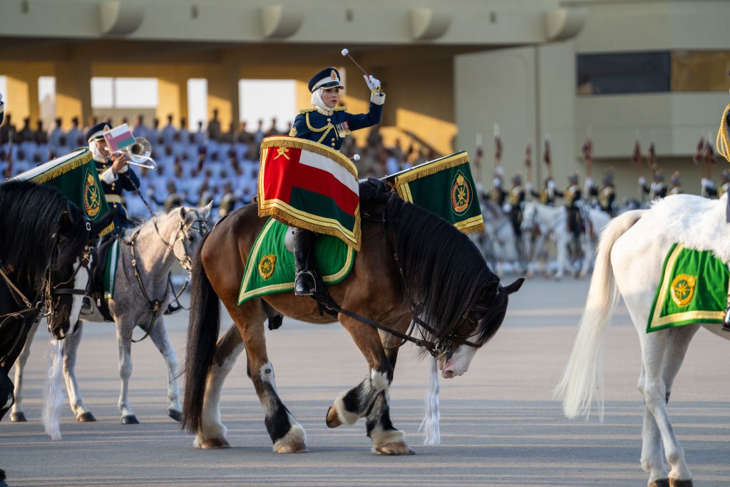 ثم أدّى طابور العرض النشيد العسكريَّ (فلْتسلَمي عُمان)، وردّد نداء الولاء والتأييد “الإيمان بالله، الولاء للسُّلطان، الذود عن الوطن”، ثم الهتاف ثلاثًا بحيـاة حضرةِ صاحبِ الجلالةِ السُّلطان هيثم بن طارق المعظم القائدِ الأعلى /حفظهُ اللهُ ورعاهُ/.
