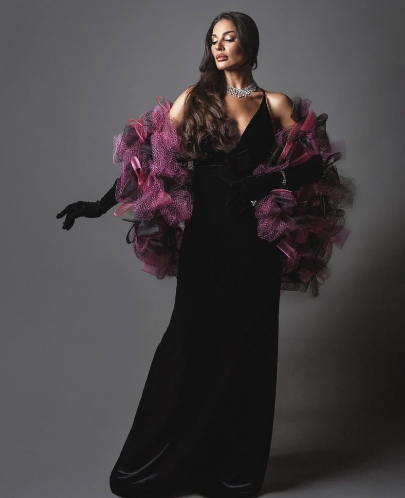 أبهرت ميلا الزهراني بفستان أسود حريري من “دانا الملا”، يزينه تفصيل فني مستوحى من ريش الطاووس. أكملت الإطلالة بمجوهرات من “بوشرون” وحذاء مزيّن بالكريستال من “غوتشي”، مما عزز لمستها الجريئة.