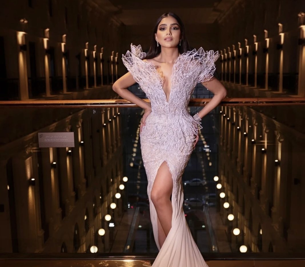 أبهرت ميلا الزهراني بفستان أسود حريري من “دانا الملا”، يزينه تفصيل فني مستوحى من ريش الطاووس. أكملت الإطلالة بمجوهرات من “بوشرون” وحذاء مزيّن بالكريستال من “غوتشي”، مما عزز لمستها الجريئة.
