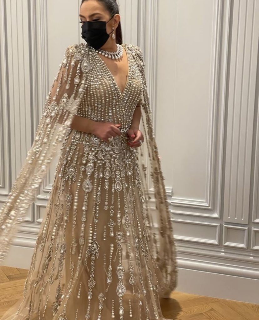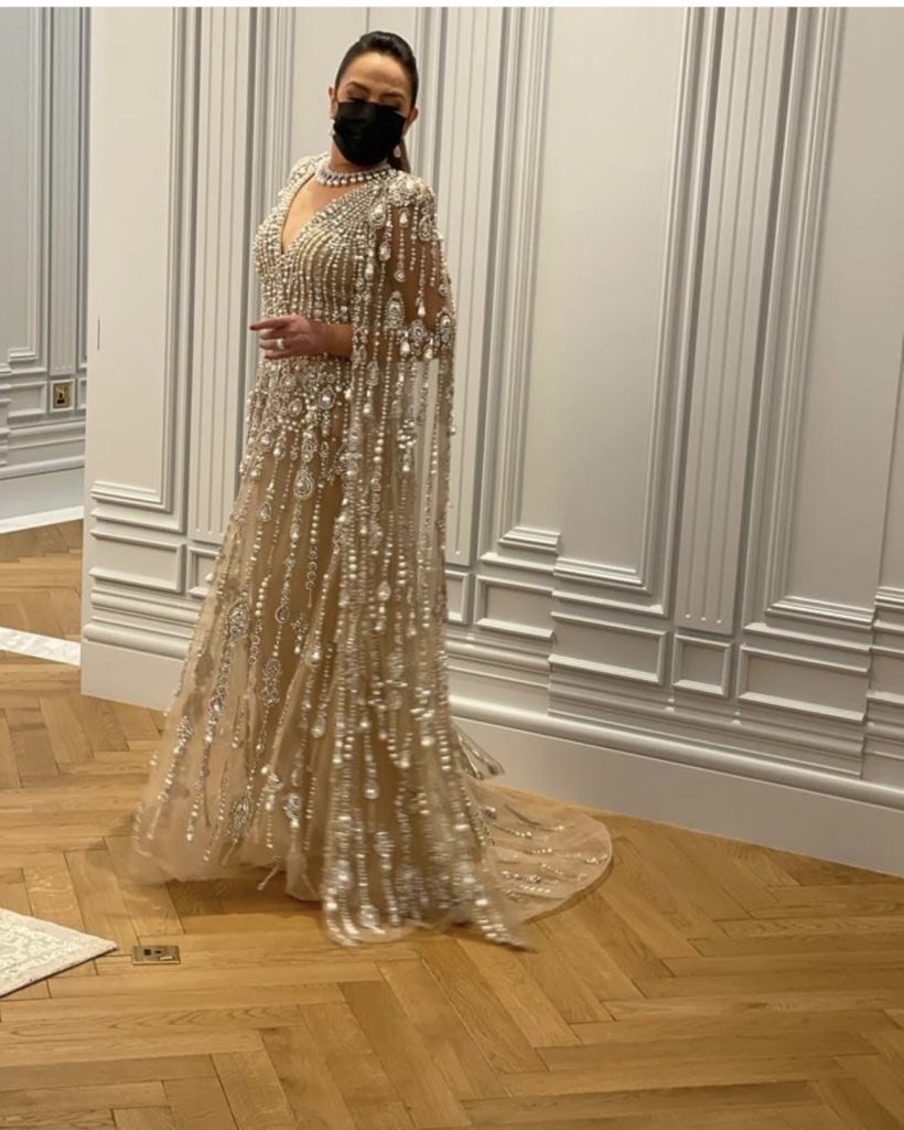 تألقت شريهان بالفستان المصنوع من الشيفون العاجي والمزيّن بتطريزات دقيقة من اللؤلؤ والكريستال وخيوط الحرير، مع أكمام واسعة وحزام ناعم أبرز خصرها. الملفت أنّ النجمة المصرية أجرت تعديلات على التصميم لجعله أكثر احتشاماً، ما يبرز ذوقها الراقي والمميز.