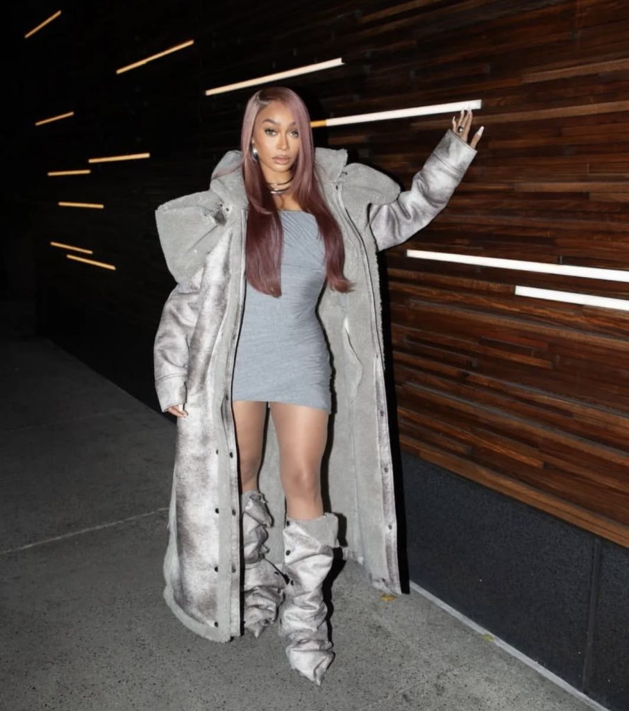 لالا أنتوني اختارت فستانًا رماديًا يعانق الجسم من Skims، نسقته مع معطف طويل وجزمة فضية من Y/Project.