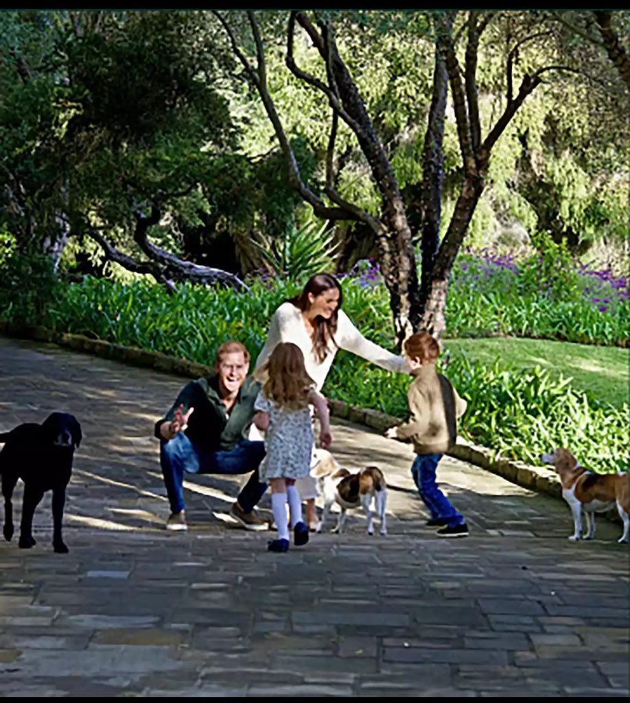 وفي صورة عائلية غير رسمية، ينحني هاري وميغان وذراعيهما ممدودتان، بينما يركض الأمير آرتشي (5 سنوات)، والأميرة ليليبت (3 سنوات) نحوهما، ووجهيهما مخفيان عن الكاميرا.