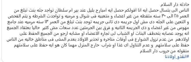 يُذكر أن المنشور كان قد دعا الشباب والفتيات إلى الامتناع عن الخروج ليلًا حفاظًا على سلامتهم، مما زاد من حالة القلق بين المواطنين.