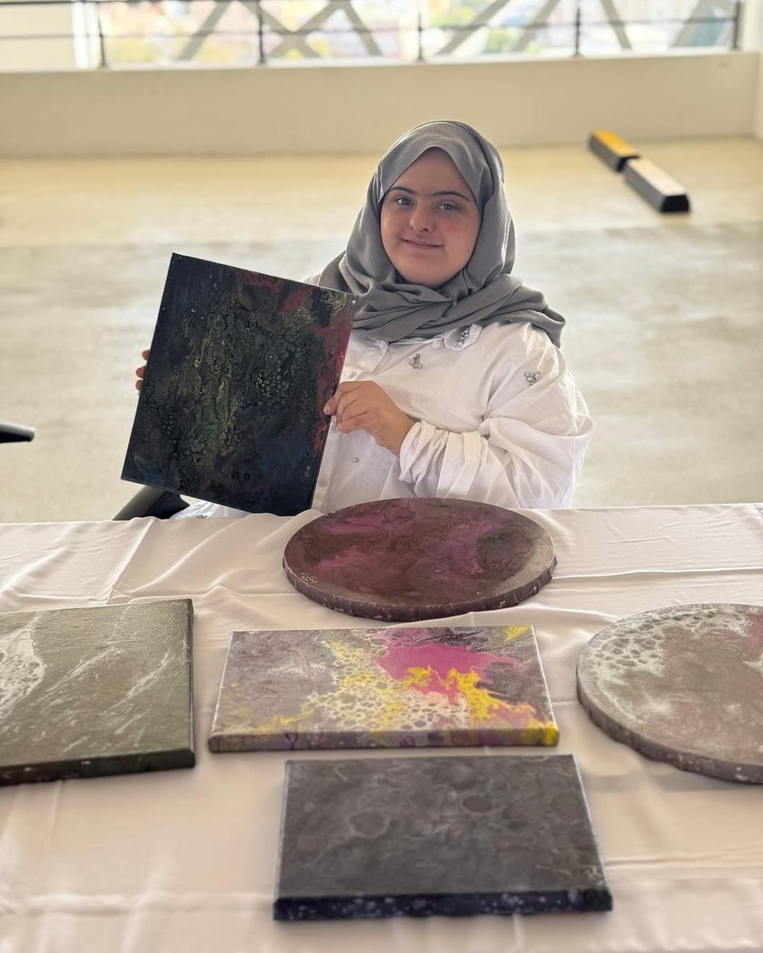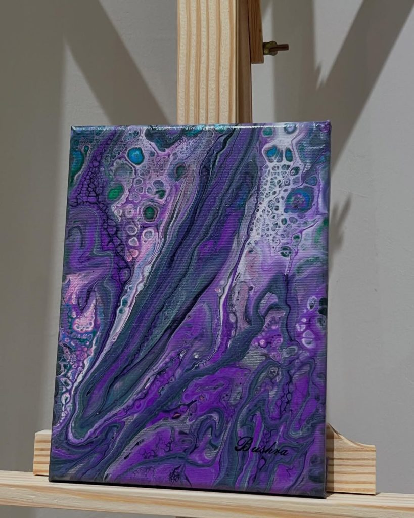ومع مرور الوقت، بدأت بشرى تشارك لوحاتها في المعارض الفنية، وتذكر والدتها تلك اللحظات السعيدة قائلة: “عندما تعرض لوحاتها في المعارض، أرى الفرح والفخر في عينيها. تصبح أكثر ثقة بنفسها، خصوصًا عندما يتفاعل الجمهور معها ويسأل عنها وعن لوحاتها. أرى كيف أن هذا التفاعل يجعلها أكثر إصرارًا على إظهار موهبتها.”