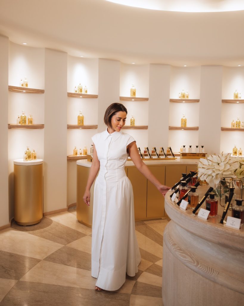 من بين أكثر إطلالات بلقيس جاذبية، كانت تلك التي ظهرت بها بفستان أبيض من القطن بنمط القميص (Shirt Dress)خلال إقامتها في فندق غيرلان. التصميم البسيط جاء بقصّة واسعة مع خصر محدد على شكل كورسيه، ما منحها مظهراً أنيقاً ومريحاً في آنٍ واحد. أكملت الإطلالة بصندل مسطح من الجلد بلون حيادي، وأقراط ماسية صغيرة، مما زاد من رقي مظهرها.