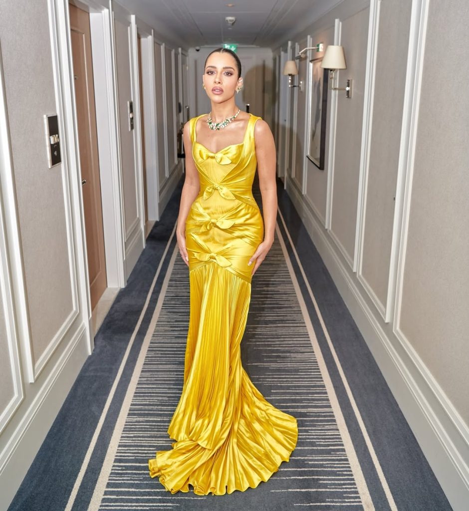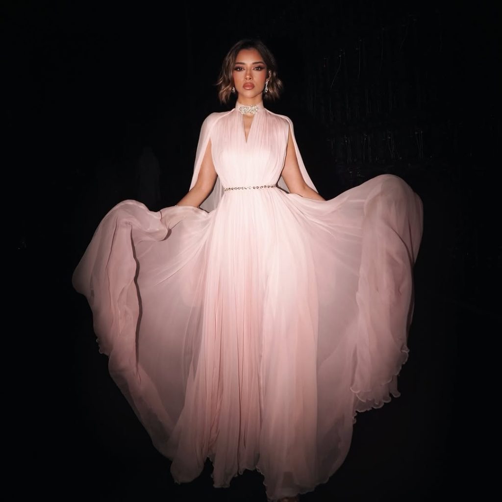 أما لشهر رمضان، فقد اختارت بلقيس إطلالة ساحرة من مجموعة FENDI Noor الكبسولية، و هي تكريم للموسم المضيء في رمضان، حيث تمزج بين التقاليد وفخامة الدار الخالدة لتعكس الروح المتألقة لهذا الشهر المبارك. تألفت إطلالة بلقيس من قميص مطرّز بالترتر البرّاق بلون البرونز، وسروال واسع من الحرير بلون “موكا موس”. الإكسسوارات لم تكن أقل فخامة، حيث نسّقت إطلالتها بحقيبة جلدية صغيرة من Fendi وحذاء مرصع بالكريستال والخرز، ما أضفى لمسة من التألق والتميز.