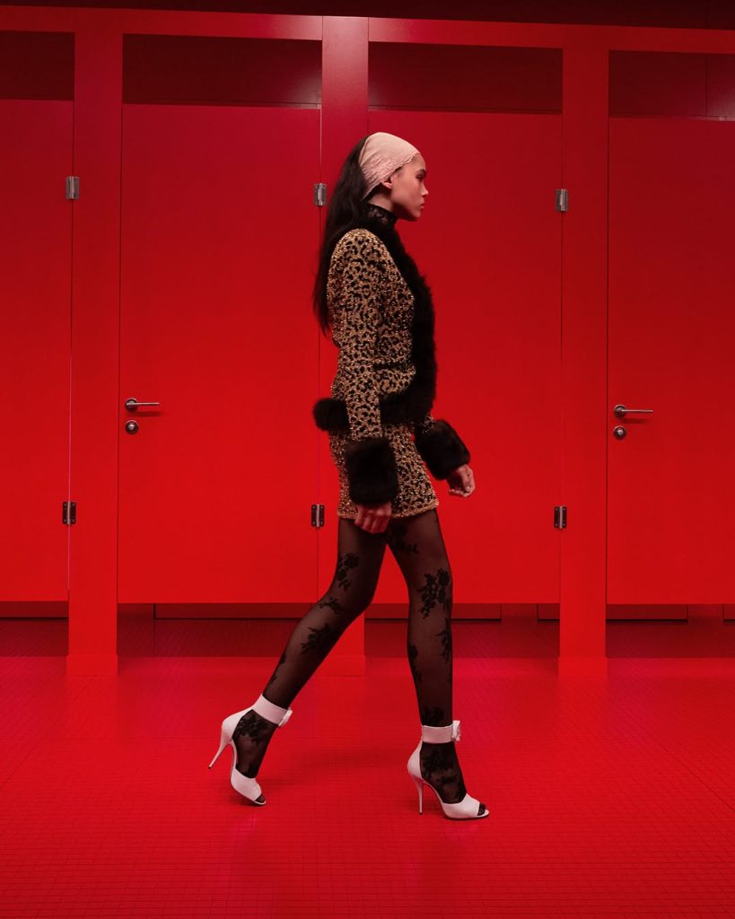 جلس المدعوون في مواجهة صفّ من مقصورات المراحيض، قبل أن يُعلن صوت تدفق المياه بداية العرض. خرج العارضون من حمامات مزيفة مغمورة بالضوء الأحمر، وهم يرتدون أحدث تصاميم المدير الإبداعي الجديد، أليساندرو ميشيل، الذي تولى قيادة الدار في مارس الماضي.