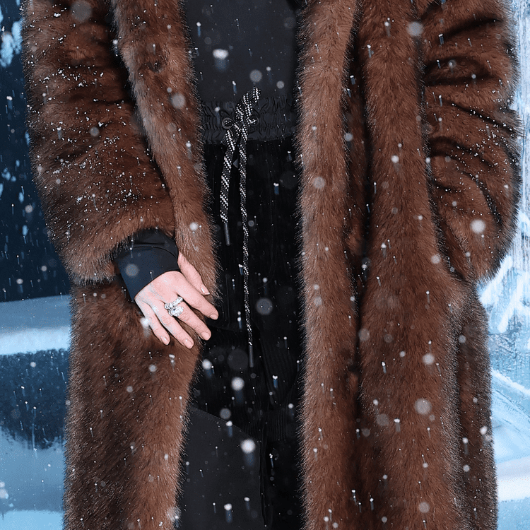 لم تكن أظافرها فقط ما لفت الأنظار، بل أيضاً تسريحة شعرها التي زادتها رقاقات الثلج سحراً. للحصول على هذا الطول المثالي، استعانت بوصلات شعر مستعارة بتدرّجات لون البُنِّي المموج والشوكولا من علامة Gee البريطانية، بينما قام مصفف الشعر لوك بلوكروز بتمشيط شعرها بتصفيفة مرتفعة عند التاج بأسلوب خلايا النحل الصغيرة، مع فرق في المنتصف لمزيد من الأناقة.