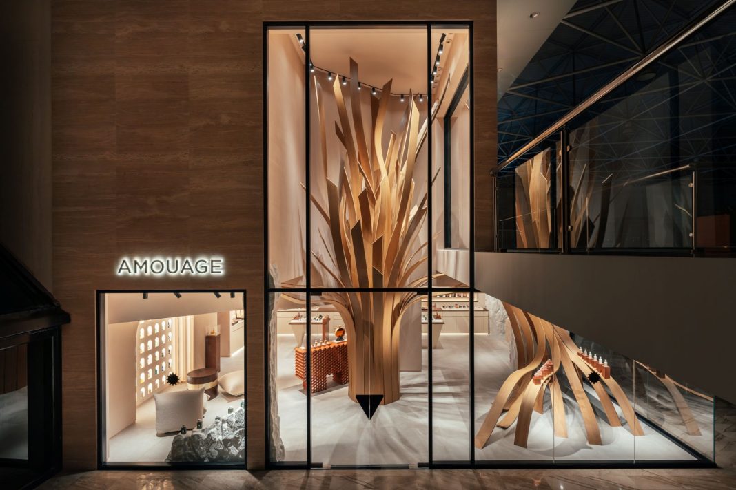 تبدأ التجربة منذ الوهلة الأولى، من الواجهة حيث يلتقي الزجاج بحجر الترافرتين الكريمي والحجر الرملي المنحوت، في توازن خلاب يهيئ الزائر لما ينتظره في الداخل. وفي قلب البوتيك، تقف بكل اعتزاز شجرة لبان خشبية بارتفاع سبعة أمتار، يقول عنها رينو سالمون، المدير الإبداعي للدار، “استلهمت هذه الشجرة من زياراتي المتكررة لوادي دوكة وقد أردتها ان تكون شجرة لا توضع داخل البوتيك فحسب، بل تشكّل تصميمه، بتفرّعها، وحجمها، ووجودها اللافت. ولتحقيق هذه الرؤية، أعدنا تصميم البوتيك بالكامل لتكون هذ التحفة الفنية في صلبه، وليس فقط جزءًا منه.”