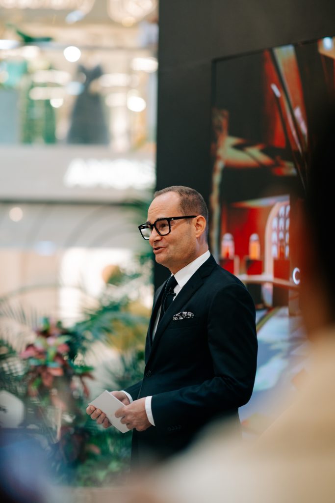 وتتجلّى تفاصيل البوتيك في اختيار خامات تنطق بالفخامة المعاصرة، من خشب البلوط الداكن، إلى الفولاذ الأسود المصقول، مرورًا بالنحاس ولمسات من ورق الذهب في توليفة تترجم هوية الدار بلغة فنية حديثة. وتكتمل روعة البوتيك بأثاثه الراقي المصمم من الفنان الفرنسي ديمتري هلينكا الحائز على جائزة بتيتنكورت.