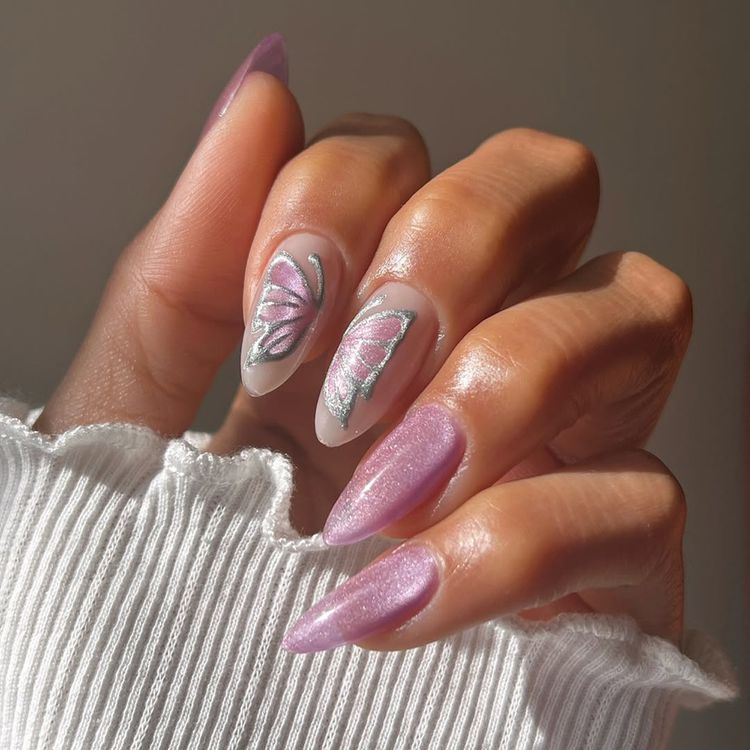 إذا كنتِ تحبين الأشكال المعبّرة التي تحمل معاني خاصة، فإنّ تصميم الفراشات المخملية هو خياركِ الأمثل. الفراشات تمثل التغيير والتحوّل، وهو ما يتناسب مع أجواء الربيع المليئة بالنمو والتجدّد. لتطبيق هذا المانيكير، قومي برسم فراشات صغيرة باستخدام طلاء الأظافر الوردي على قاعدة من المخمل، مع إضافة لمسات من اللمعان لجعل التصميم ينبض بالحياة.