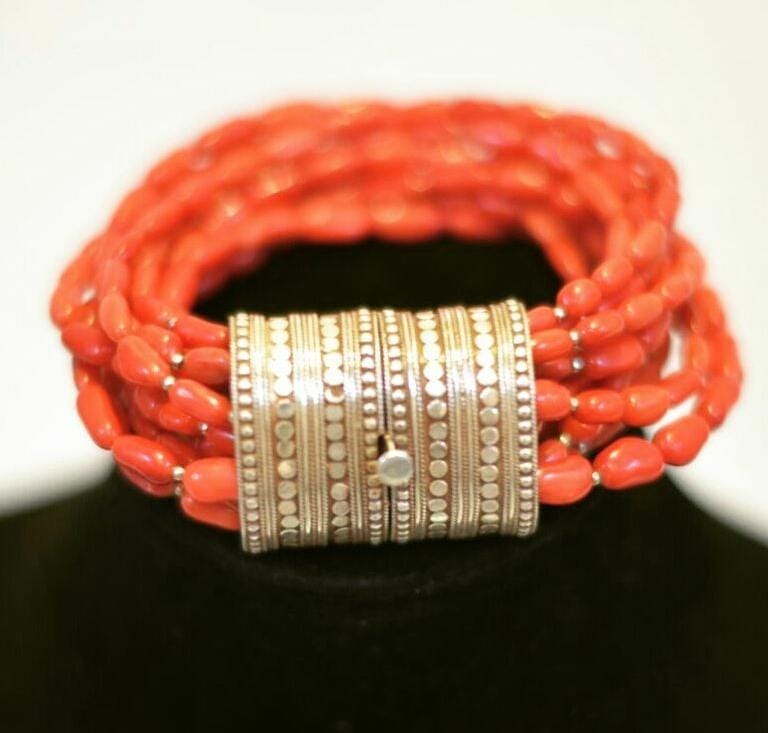 ونستخدم خامات فاخرة مثل الجلود الطبيعية والفضة والذهب عيار 24 قيراطًا، مما يمنح الحقائب بريقًا استثنائيًا. كما يتم تنفيذها يدويًا بعناية فائقة لإبراز التفاصيل التراثية، مع إمكانية دمج أحجار كريمة لزيادة قيمتها. بعض الحقائب تم تصميمها لتتناغم مع المجوهرات، بحيث تعكس نفس الزخارف والنقوش، مما يحقق تناغمًا في الإطلالة.