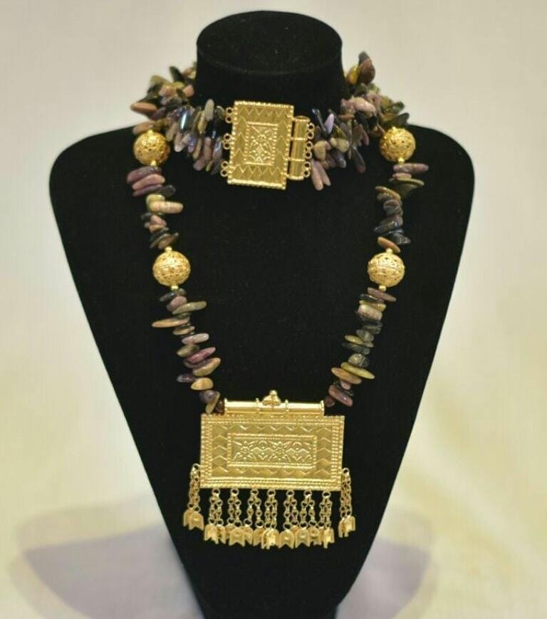 تفاصيل التصميم جاءت مستوحاة من الزخارف التقليدية العُمانية، والنقوش الفضية القديمة، والعمارة العمانية العريقة، ما جعلها تحمل هوية فريدة تنبض بجمال التراث. تم استخدام الذهب عيار 21 جنبًا إلى جنب مع أحجار كريمة نادرة، ما منح القطعة لمعة استثنائية وفخامة لا مثيل لها.
